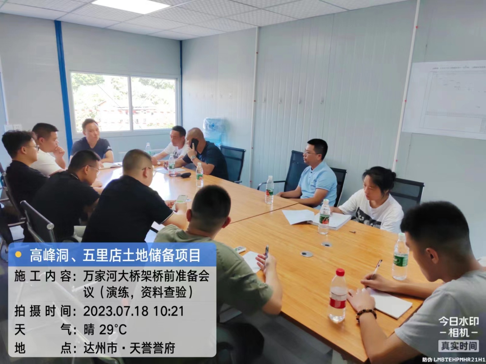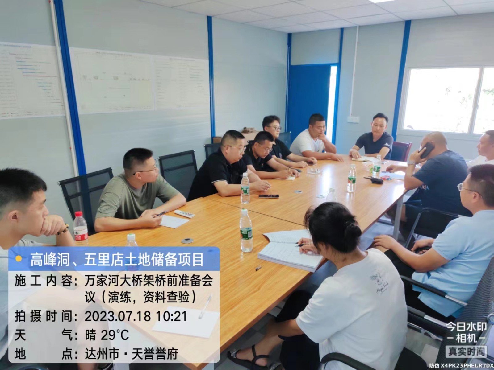 在正式吊装前,监理部罗勇总监组织建设单位、监理单位、施工单位召开了小箱梁吊装预演专题准备会议。要求对特种作业人员证件、机械设备进场报审资料再次进行核查,确保人证合一;要求对导梁及吊车的型号和荷载进行验收,确保满足方案要求;对导梁的主体及连接件再次进行检查,确保结构强度和稳定性;对炮车驾驶员、汽车起重机操作手、起重信号司索工、安全员、施工员等每个人员的职责分工与风险防控措施进行详细了解;在施工现场进行吊装各项流程模拟预演,确保所有人员了解专项方案的施工工艺及流程。