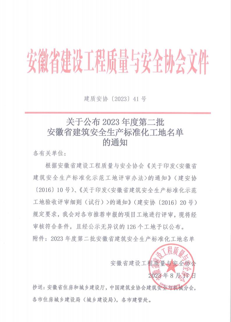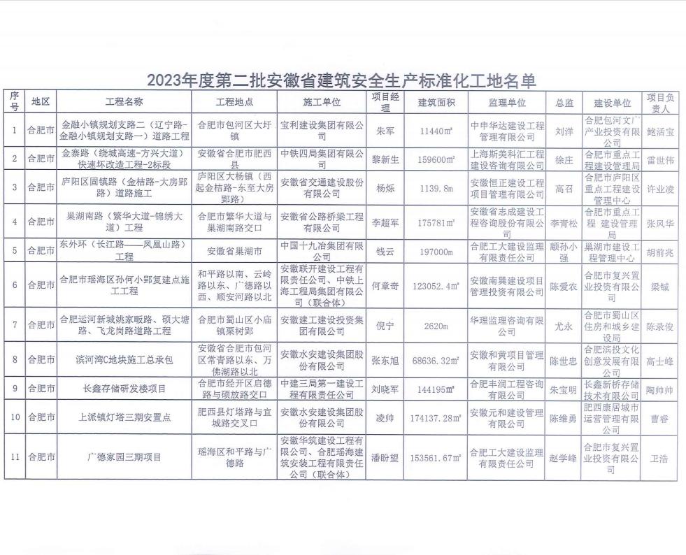 近日,安徽省建设工程质量与安全协会公布了2023年度第二批安徽省建筑安全生产标准化工地名单,中申华达公司监理的金融小镇规划支路二(辽宁路-金融小镇规划支路)道路工程项目获得该奖项。在此对中申华达公司又一监理项目成功获奖表示热烈地祝贺,并对支持及关心公司发展的社会各界表示由衷地感谢。