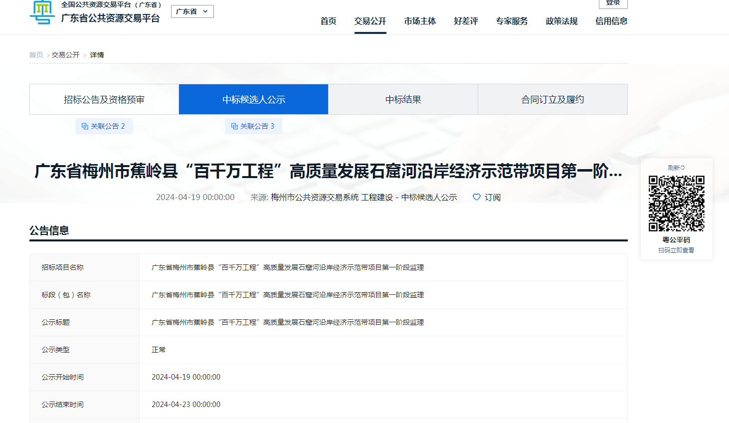 近日,广东省公共资源交易平台发布了广东省梅州市蕉岭县“百千万工程”高质量发展石窟河沿岸经济示范带项目第一阶段监理的中标结果公告,经评审专家综合审定,中申华达建设工程管理有限公司为该项目中标单位。该项目风貌管控提升256725平方米、 三线整治13592米等,总投资约3.36亿元,监理中标金额213.528万元。