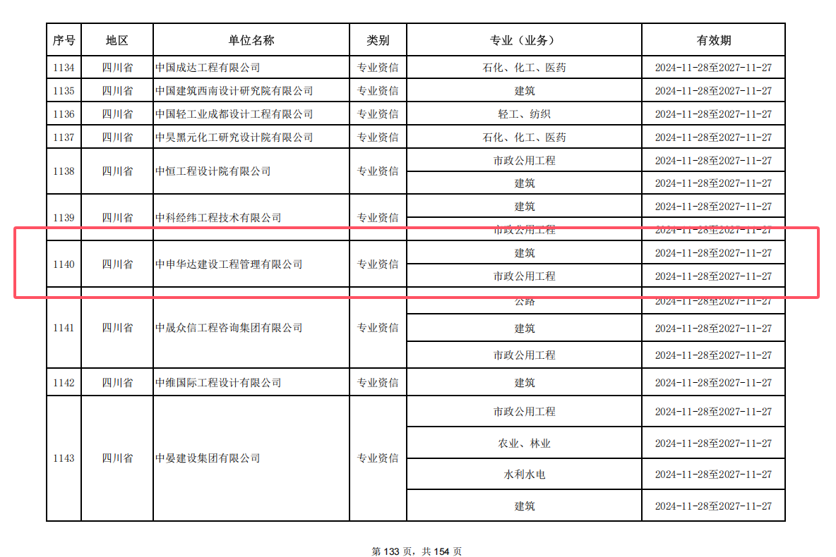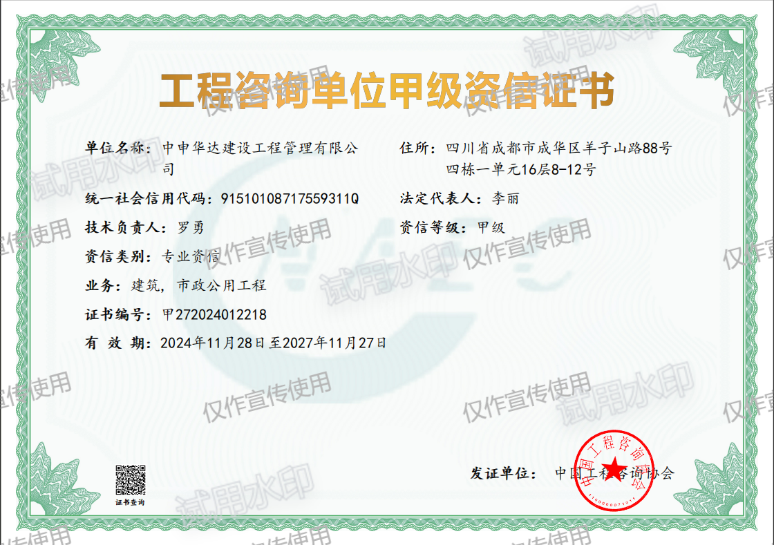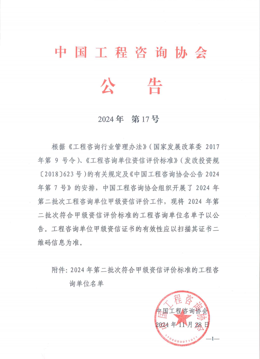 11月28日,中国工程咨询协会发布公告(2024年第17号),对符合甲级资信评价标准的工程咨询单位名单予以公告。中申华达公司荣获工程咨询(建筑工程、市政公用工程)甲级资信。