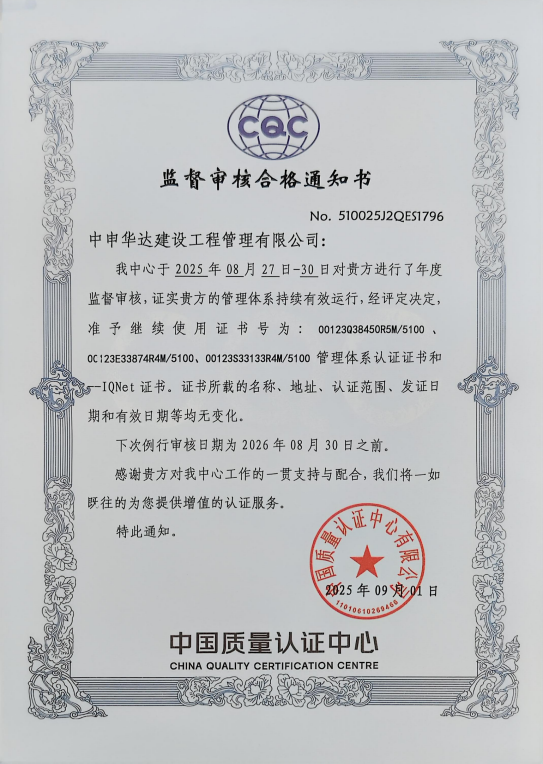 此次顺利通过监督审核,不仅是对中申华达现有管理体系与业务能力的权威认证,更是公司持续提升服务质量、强化责任意识的有力鞭策。未来,中申华达将以此次审核为新起点,不断优化管理体系,精进技术服务,在工程领域持续深耕,为客户提供更优质、更可靠的服务,以实际行动诠释企业担当,书写行业高质量发展新篇章!