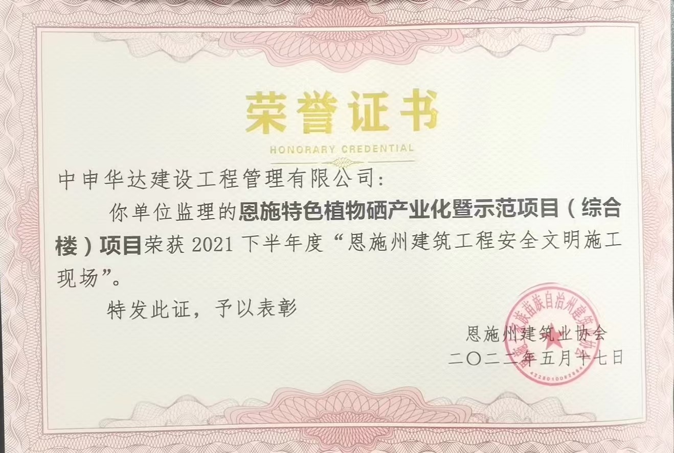 2021下半年度“恩施州建筑工程安全文明施工现场”证书